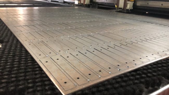 Découpage laser et poinçonnage de pièces industrielles en acier. Sur notre combiné laser poinçonnage Amada, nous sommes en capacité de découper en grande série des pièces industrielles, telles que des « lardons » en acier. Découpées avec précision, ces petites pièces en acier sont maintenu sur la tôle après découpe à l’aide d’une micro-jonction. Après usinage, l’opérateur…